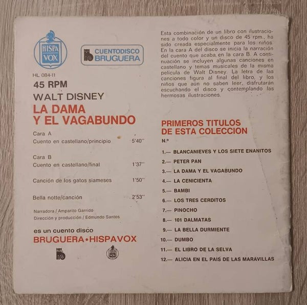CUENTO CUENTODISCO LA DAMA Y EL VAGABUNDO DISNEY BRUGUERA 1979 ( SOLO EL CUENTO)